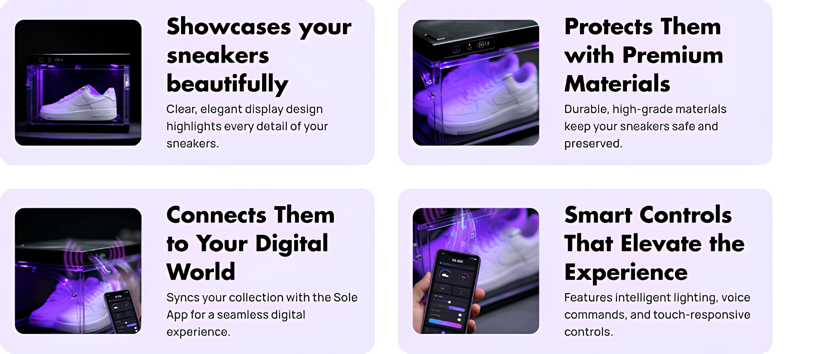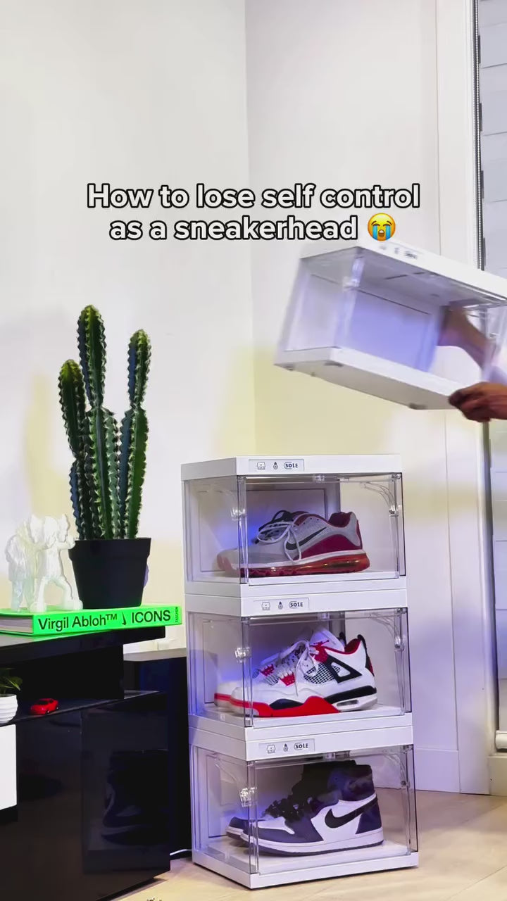The Sole Vault is a smart, light-up sneaker display with customizable lighting, freshness-preserving technology, and voice-controlled access. Designed to protect your sneakers and showcase them in style.